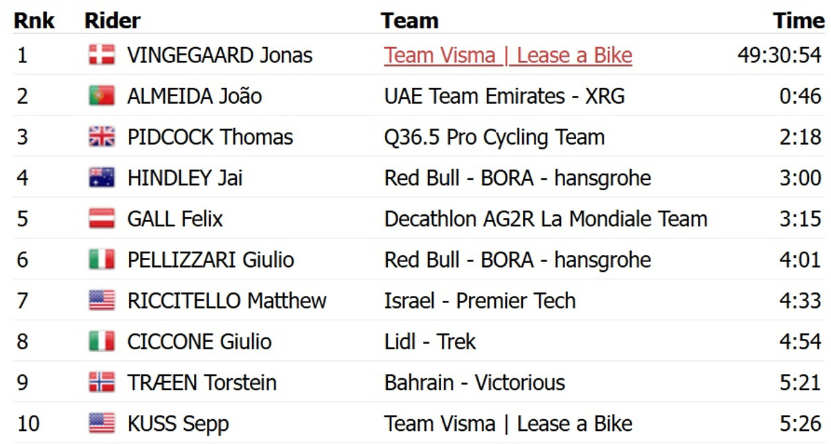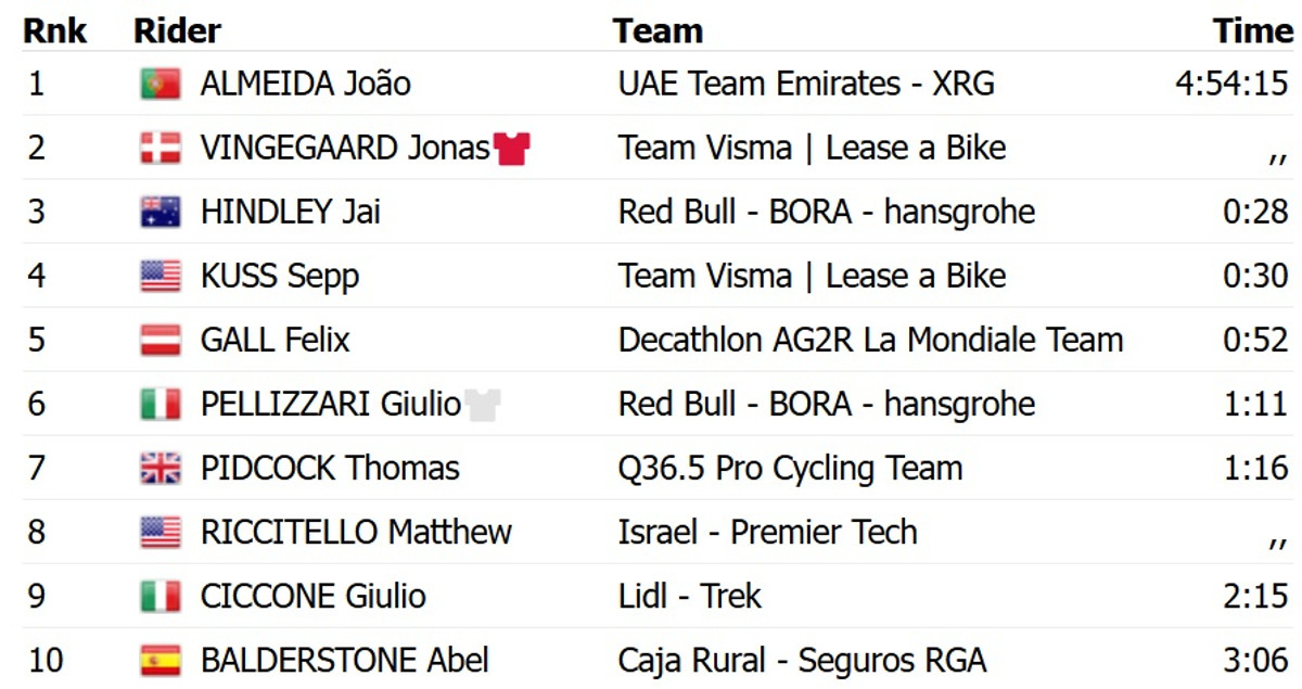 Алмейда у боротьбі на фініші випередив данця Йонаса Вінгегора із Visma Lease a Bike, якому вдалося відбити атаки свого суперника та зберегти червону майку лідера загального заліку.