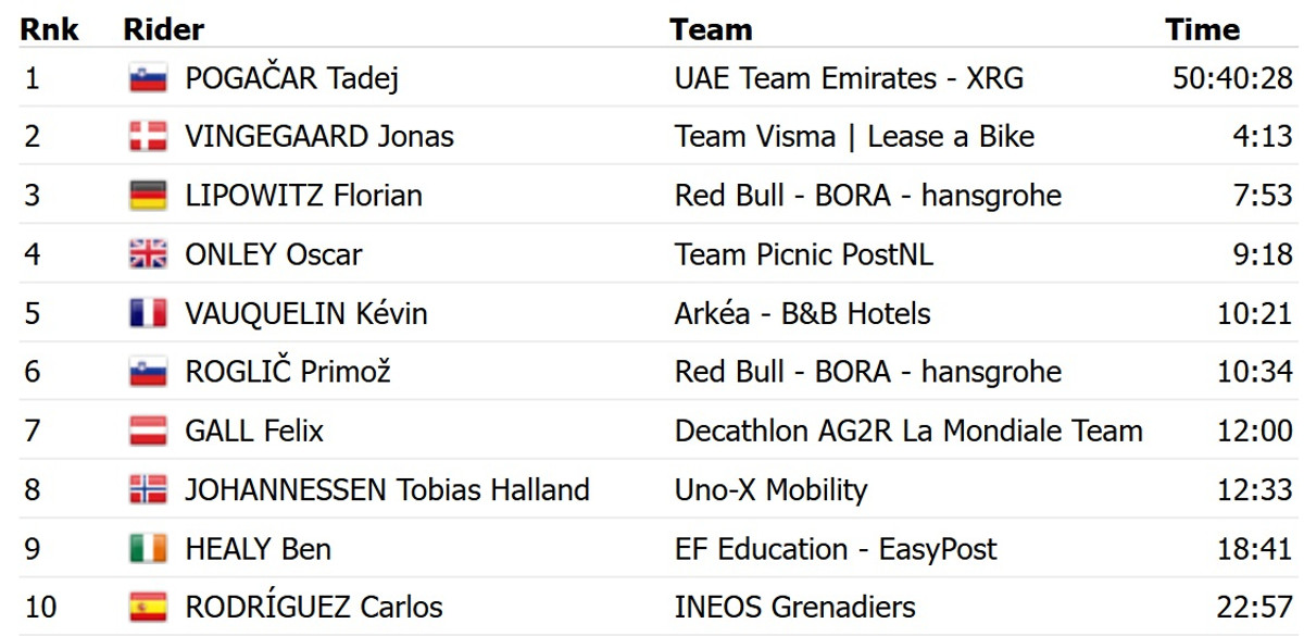 Погачар, який виграв два попередні етапи, закріпив своє лідерство у загальному заліку. Ремко Евенепул, який ішов третім перед стартом 14 етапу, сьогодні зійшов із дистанції. На проміжний подіум піднявся німець Флоріан Ліповітц із Red Bull Bora.