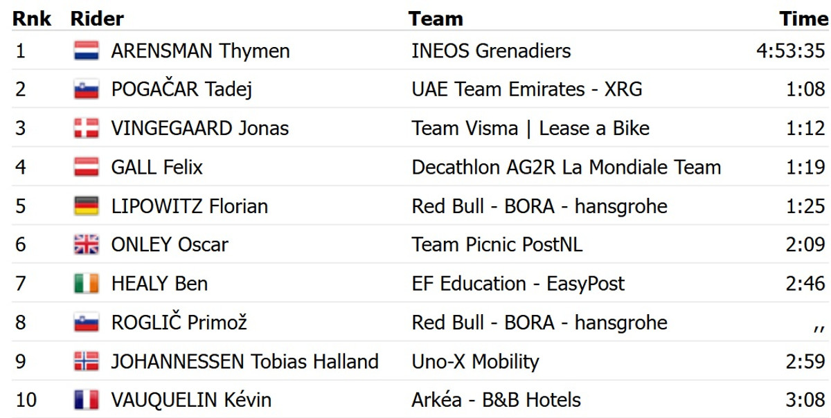 Аренсман став єдиним учасником відриву дня, якого пелотону не вдалося наздогнати. Він випередив двох лідерів загального заліку Туру – словенця Тадея Погачара з UAE Emirates і данця Йонаса Вінгегора з команди Visma Lease a Bike.