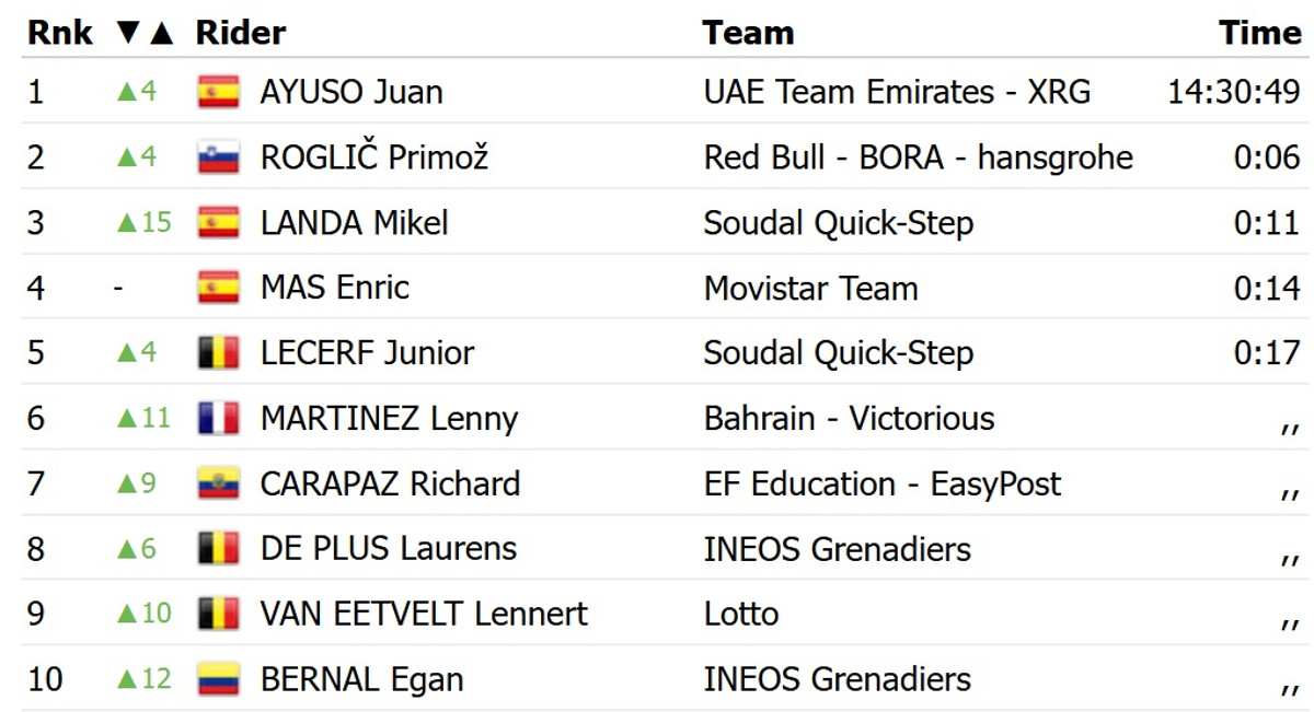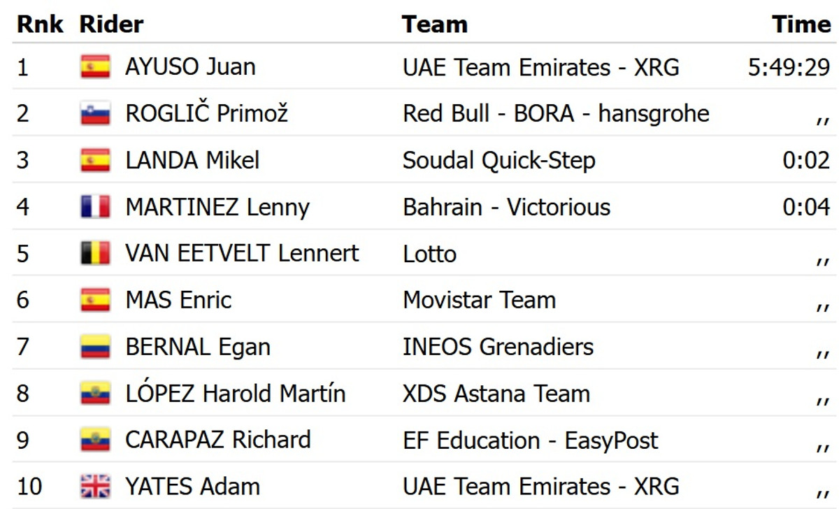 На фініші Аюсо випередив словенця Пріможа Рогліча з команди Red Bull Bora. Топ-3 замкнув іспанець Мікель Ланда із Soudal Quick Step, який програв дві секунди. Аюсо завдяки цій перемозі перехопив лідерство у загальному заліку Туру Каталонії.
