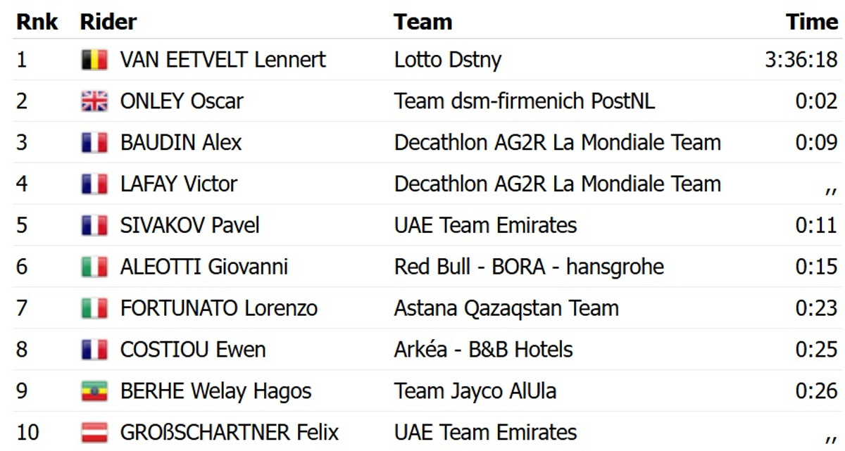 Ван Етвелт на дві секунди випередив британця Оскара Онлі з команди DSM Firmenich. Третім з відставанням в 9 секунд став француз Алекс Буден з Decathlon Ag2r.