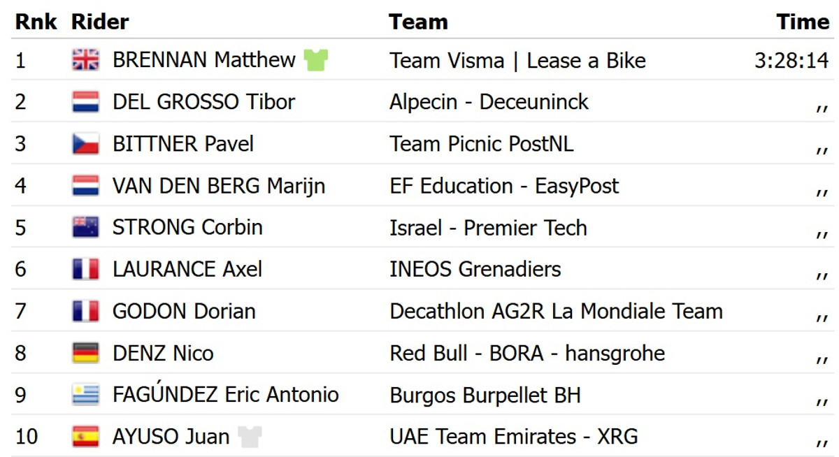 Лідерство у загальному заліку перехопив іспанець Хуан Аюсо з UAE Emirates, який тепер на 1 секунду випереджає Пріможа Рогліча. Леннерт Ван Етвелт програв 44 секунди в ешелонах і відступив з шостої позиції на восьму.