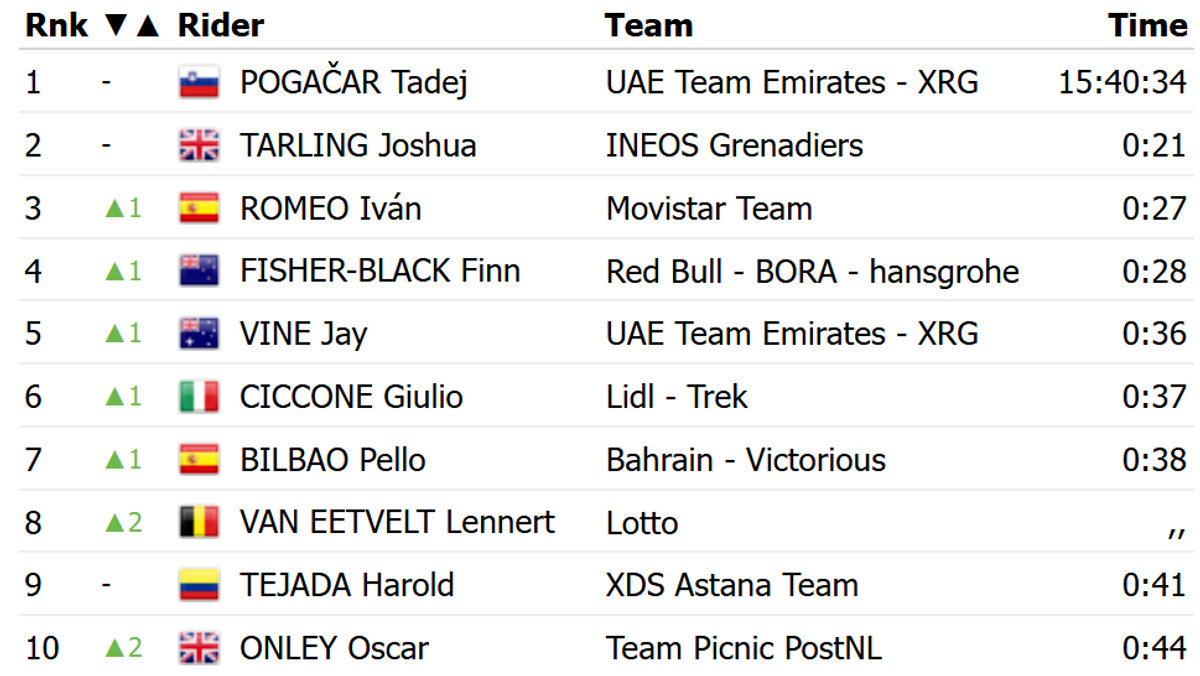 Лідерство у загальному заліку зберіг словенець Тадей Погачар із UAE Emirates, який разом із чинним чемпіоном гонки, бельгійцем Леннертом Ван Етвелтом із Lotto, брав участь у відриві дня.