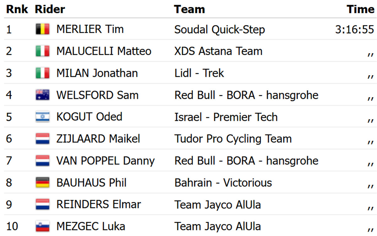 Доля перемоги вирішувалася в масовому спринті з пелотону, хоча частина гонщиків виявилися відсічена двома завалами, які трапилися на останніх кілометрах дистанції. Мерлір виявився швидшим за двох італійців – Маттео Малучеллі з XDS Astana та Джонатана Мілана з Lidl Trek, який вчора виграв четвертий етап.