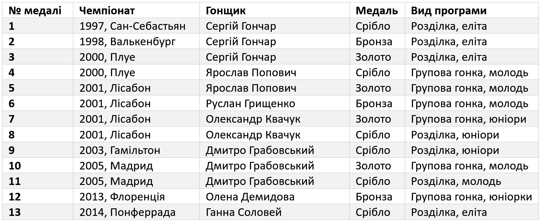 У 2005 році в Мадриді золото та срібло в груповій гонці та розділці відповідно серед молоді завоював Дмитро Грабовський, який пішов із життя у січні 2017 року у віці всього 31 року. Дві нагороди Грабовського дозволили Україні посісти друге місце у медальному заліку мундіалю-2005. Двома роками раніше, у 2003 році в канадському Гамільтоні той же Грабовський завоював срібло в розділці серед юніорів. Ще одну медаль – бронзу – Україні принесла Олена Демидова в груповій гонці серед юніорок у 2013 році у Флоренції.