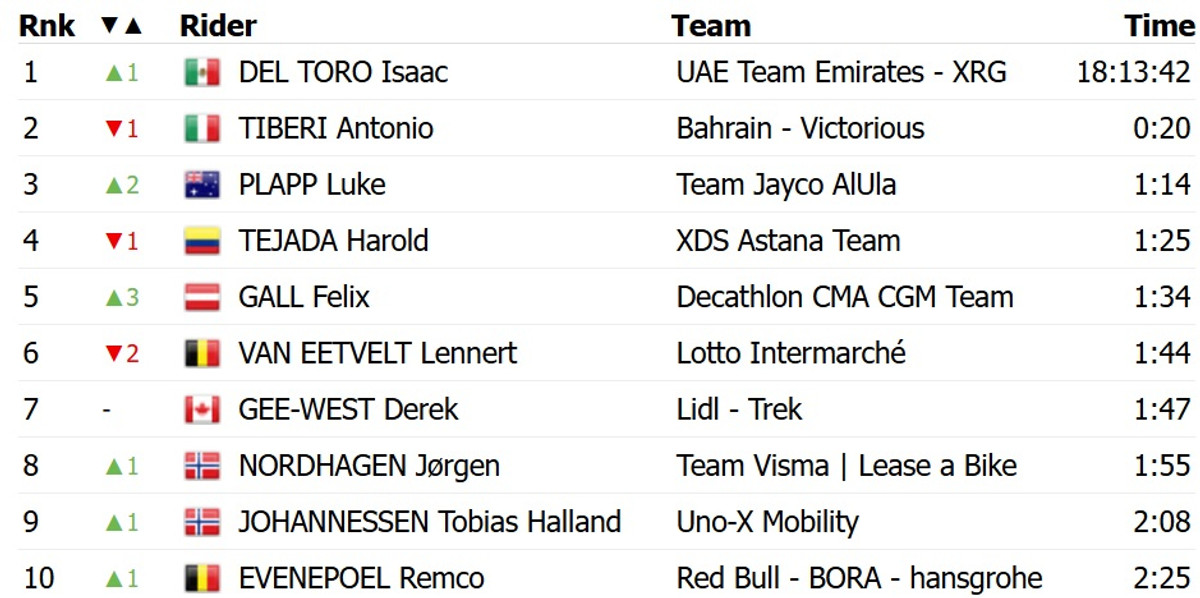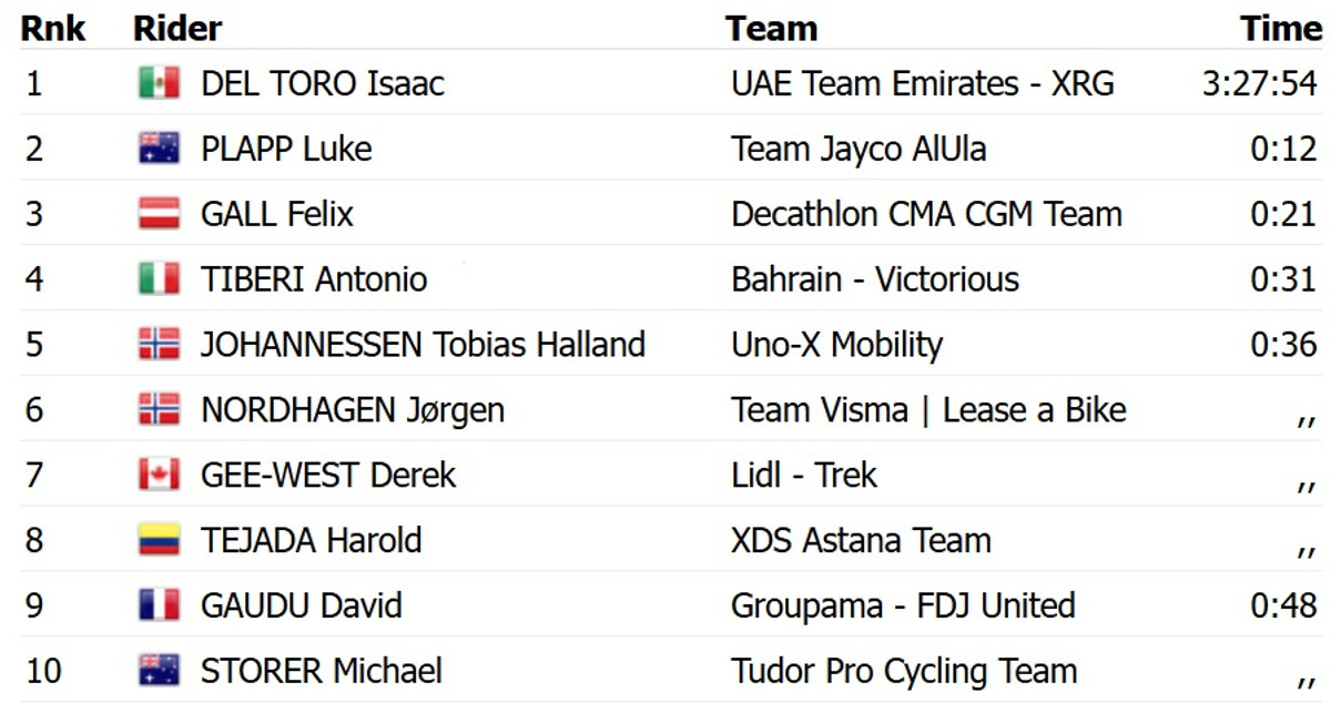 Дель Торо на 12 секунд випередив австралійця Лукаса Плаппа з Jayco AlUla. Топ-3 із відставанням у 21 секунди замкнув австрієць Фелікс Галль із Decathlon CMA CGM. Четверти фінішував італієць Антоніо Тібері з Bahrain Victorious, який втратив червону майку лідера загального заліку.