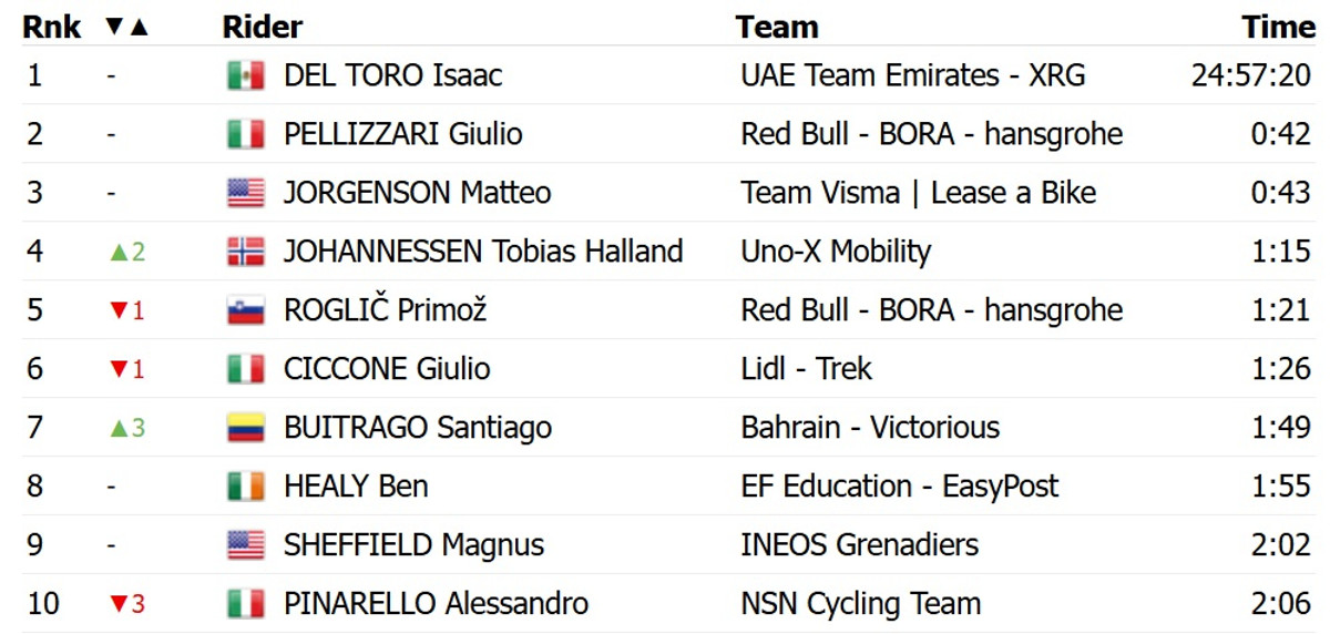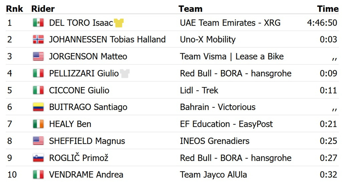 Дель Торо на 3 секунди випередив норвежця Тобіаса Халланда Йоханнессена з UnoX і американця Маттео Йоргенсона з Visma Lease a Bike. Цей успіх дозволив мексиканцеві закріпити своє лідерство в загальному заліку.