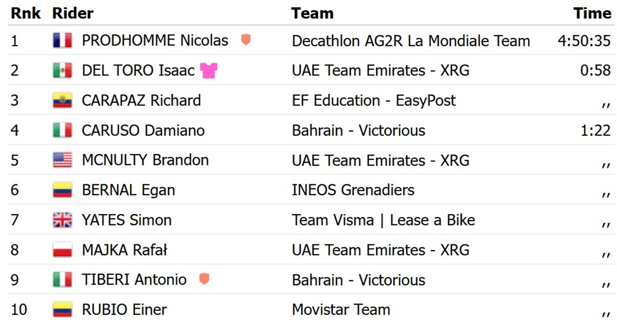 Продомм був учасником відриву дня і став єдиним, хто втримався під натиском пелотону. Друге та третє місця забрали лідер і віцелідер загального заліку – мексиканець Ісаак Дель Торо з UAE Emirates і еквадорець Річард Карапас із EF Education EasyPost.