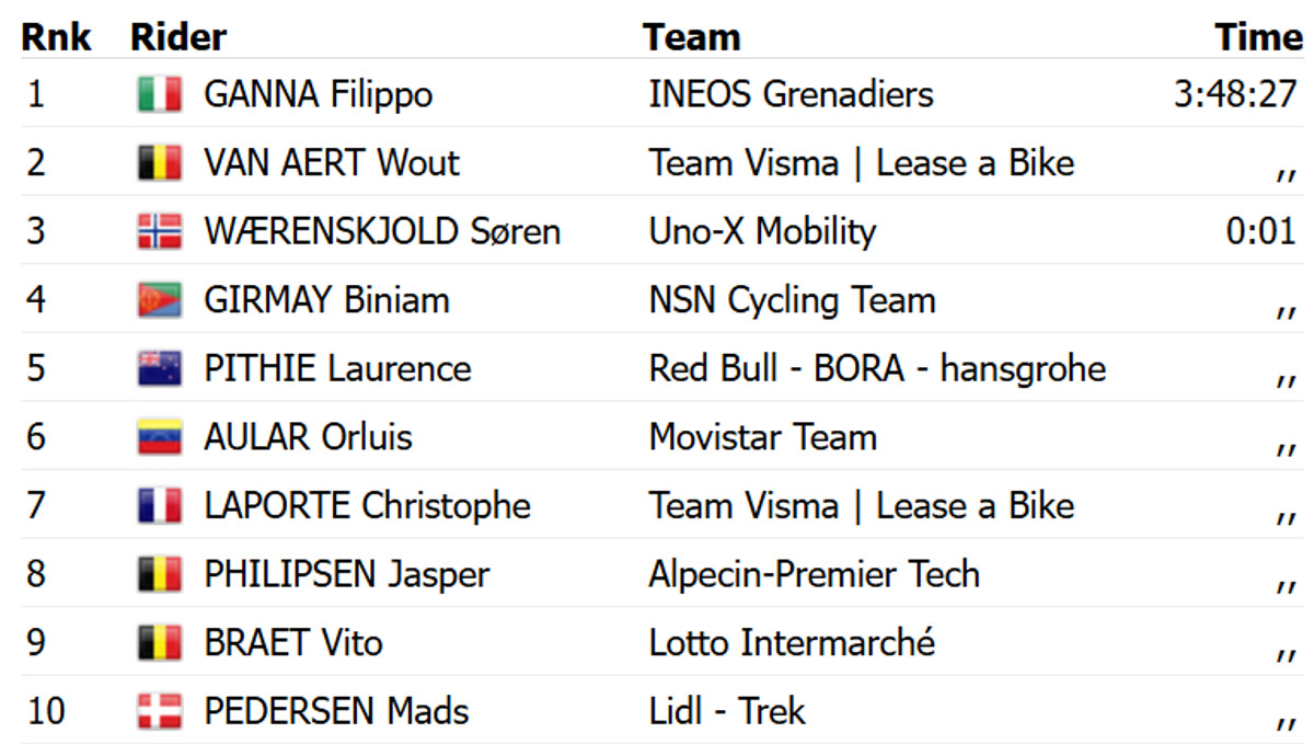 Завдяки пізній контратаці з пелотону Ганна на фінішній прямій випередив бельгійця Воута Ван Арта з команди Visma Lease a Bike, який другий рік поспіль посів на Дварс доор Фландерен друге місце. Топ-3 в спринті з пелотону замкнув норвежець Сорен Вереншольд із команди UnoX.