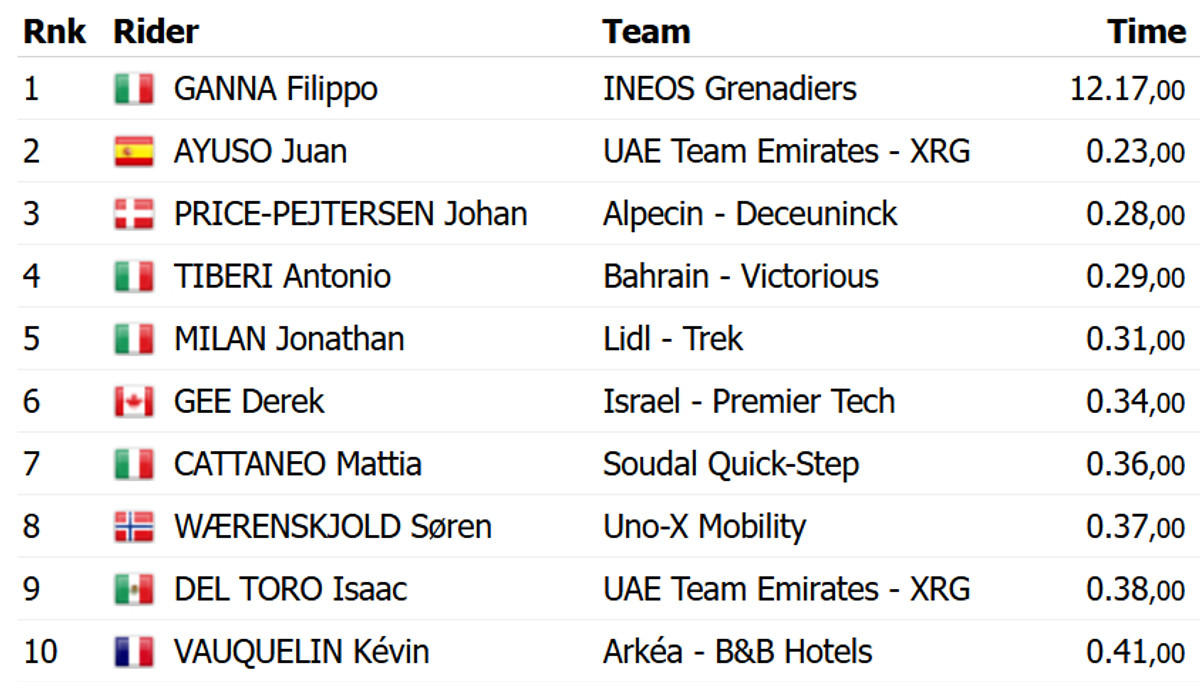 Дворазовий чемпіон світу в розділці на 23 секунди випередив одного з фаворитів загального заліку, іспанця Хуана Аюсо з команди UAE Emirates. Топ-3 замкнув данець Йохан Прайс-Пейтерсен із Alpecin Deceninck. Четвертим фінішував ще один претендент на найвищі місця у генеральній класифікації, італієць Антоніо Тібері з Bahrain Victorious.