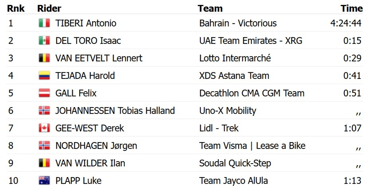 Тібері на фініші на 15 секунди випередив переможця першого етапу, мексиканця Ісаака Дель Торо з команди UAE Emirates. Топ-3 замкнув бельгієць Леннерт Ван Етвелт із Lotto Intermarche. Цей успіх дозволив італійцеві перехопити червону майку лідера загального заліку.