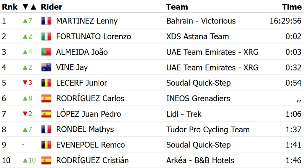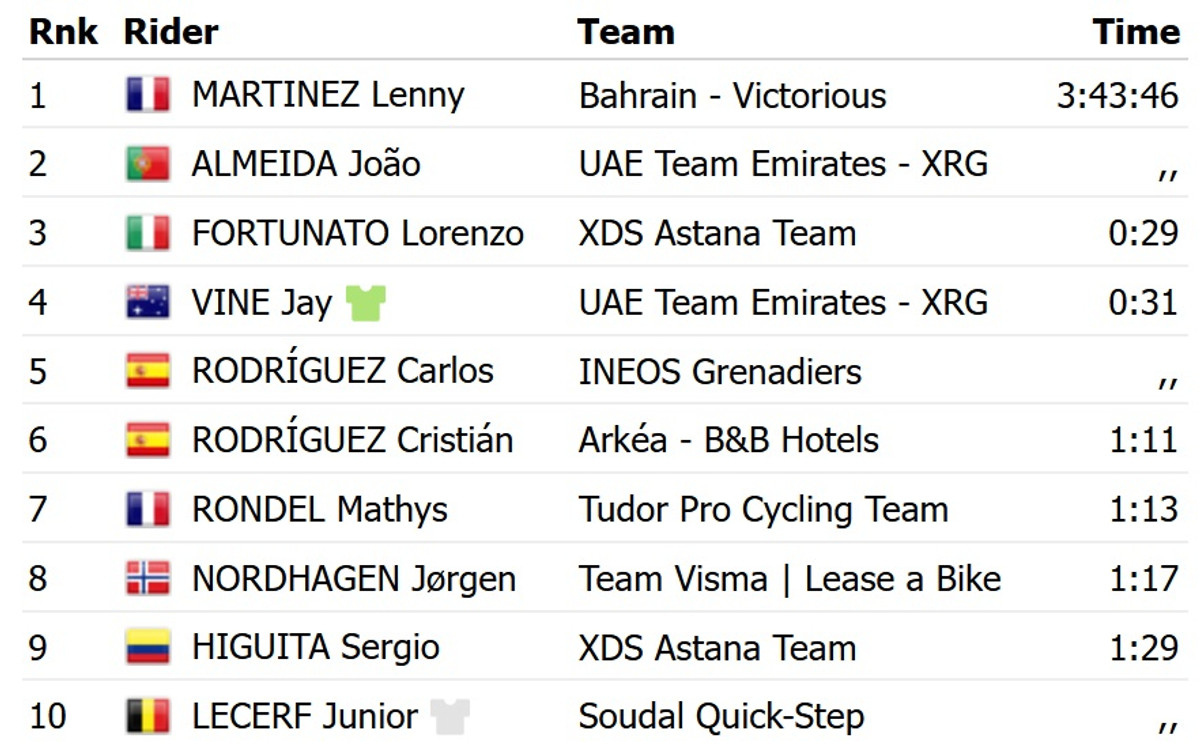 Мартінес у фінішному спринті випередив португальця Жоау Алмейду з команди UAE Emirates. Топ-3 із відставанням у 29 секунд замкнув італієць Лоренцо Фортунато із XDS Astana. Французу цей успіх дозволив перехопити лідерство у загальному заліку багатоденки.