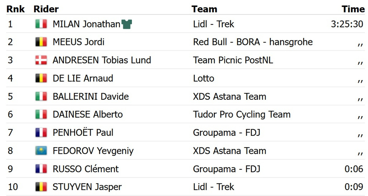 Мілан у фінішному спринті випередив бельгійця Йорді Меуса з Red Bull Bora. Топ-3 замкнув данець Тобіас Лунд Андерсен із Picnic PostNL. Цілий ряд зіркових спринтерів на чолі з Тімом Мерліром та Біньямом Гірмаєм виявилися відрізаними від пелотону завалом за кілометр до фінішу.