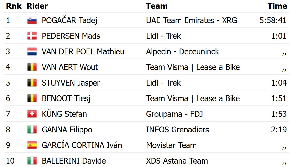 В підсумку Погачар більш ніж на одну хвилину випередив групу переслідувачів. Спринт за друге місце виграв данець Мадс Педерсен із команди Lidl Trek. Третім став триразовий і минулорічний переможець Туру Фландрії, нідерландець Матьє Ван дер Пул із Alpecin Deceuninck. Зірковий бельгієць Воут Ван Арт із Visma Lease a Bike залишився без подіуму – четверте місце.