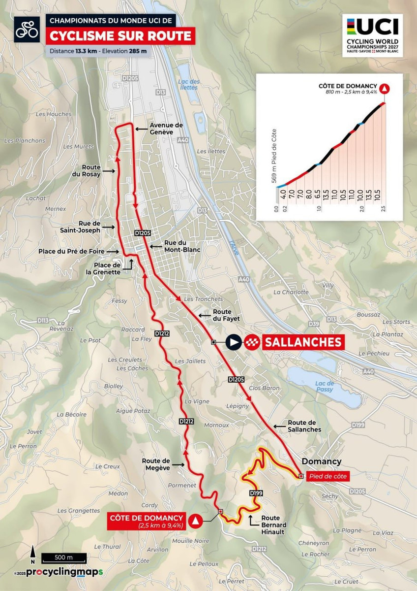 Що стосується рельєфу (сумарний набір висоти – 3400 метрів проти 6000 на ЧС-2025), то головні його складнощі будуть розташовані на першій половині дистанцї. Буквально зі старту гонщики почнуть штурмувати підйом Коль ду Мулен – 4 км з середнім градієнтом у 5,1%. Далі – спуск і рівнина. Через 47,5 км після старту гонщики заїдуть на перше з трьох великих кіл. Там головним випробуванням буде перевал Сен Ромен де Лерпс – 7 км з середнім градієнтом у 7,2%. Окрім нього, на великому колі також долатиметься короткий, проте крутий підйом Валь д’Енфер – 1,6 км, 9,7%.