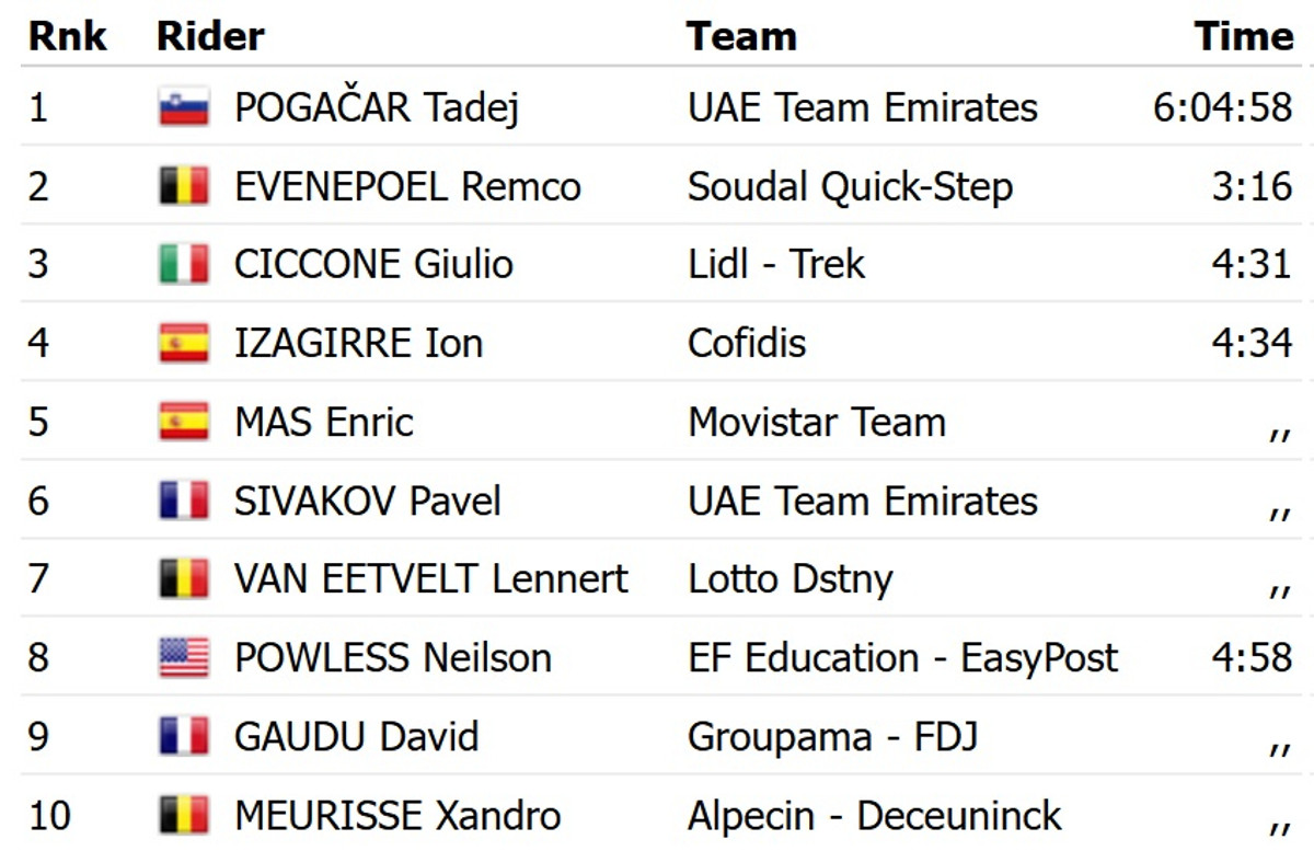Вирішальною виявилась атака словенця за 48 км до фінішу на підйому Кольма ді Сормано. Найближчого переслідувача, бельгійця Ремко Евенепула з Soudal Quick Step, Погачар у підсумку випередив на 3 хвилини і 16 секунд. Топ-3 замкнув італієць Джуліо Чікконе із Lidl Trek.