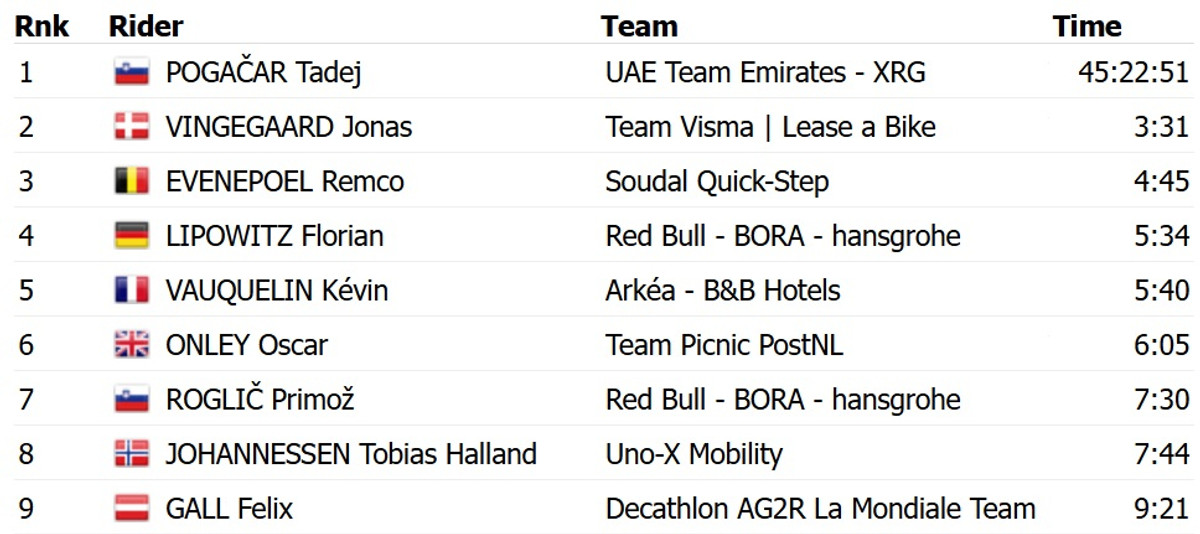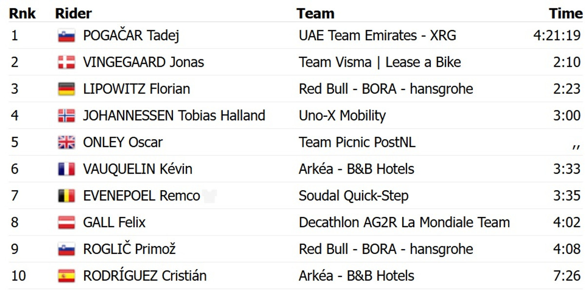 Погачар атакував від самого підніжжя Отакама, моментально скинувши з колеса усіх суперників. У підсумку найближчому переслідувачу, данцеві Йонасу Вінгегору з Visma Lease a Bike, він привіз 2 хвилини і 10 секунд. Топ-3 з відставанням у 2 хвилини і 23 секунди замкнув німець Флоріан Ліповітц із Red Bull Bora.