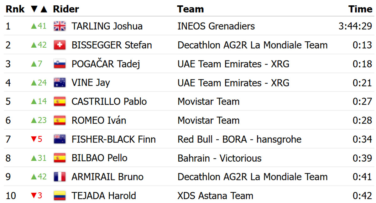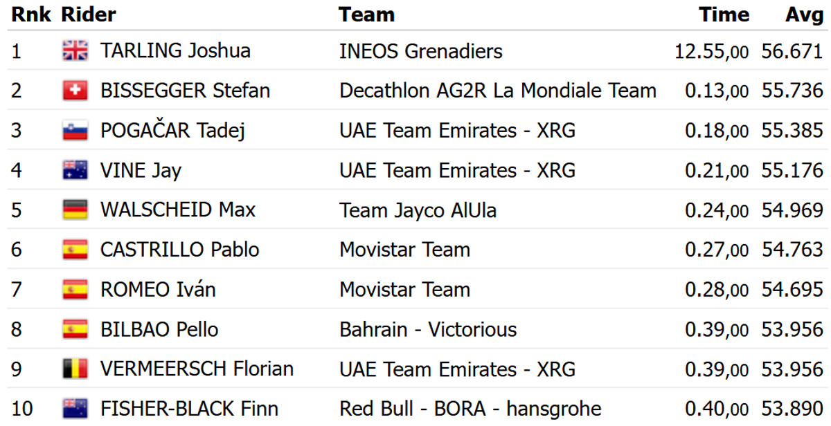 Тарлінг подолав дистанцію за 12 хвилин і 55 секунд. Він на 13 секунд випередив швейцарця Штефана Біссеггер із Decathlon Ag2r і словенця Тадея Погачара з UAE Emirates. Британець завдяки цій перемозі перехопив лідерство у загальному заліку багатоденки.