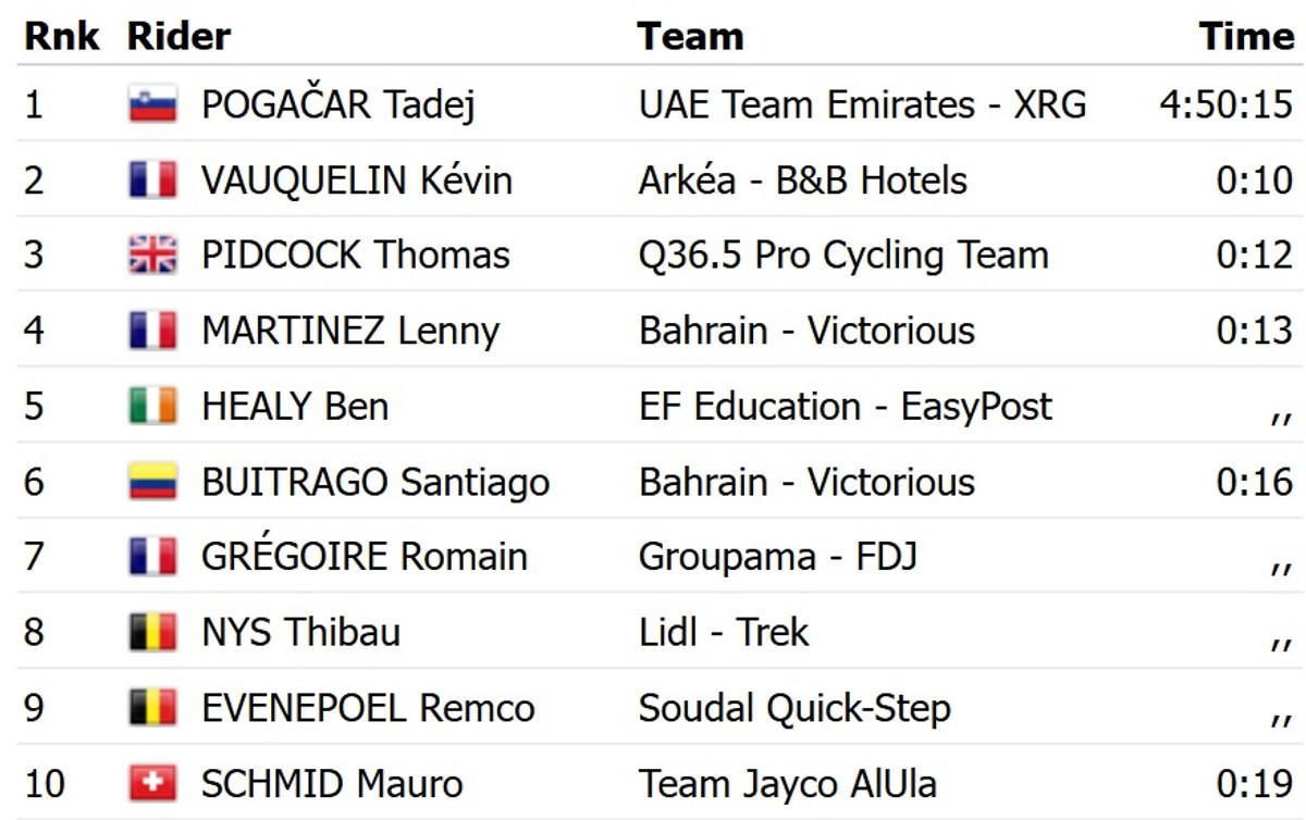 Чинний чемпіон світу в груповій гонці завдяки атаці на останньому кілометрі дистанції на 10 секунд випередив найближчого переслідувача, француза Кевіна Воклена з команди Arkea B&B Hotels. Топ-3 замкнув британець Том Підкок із Q36.5, який відстав від словенця на 12 секунд.