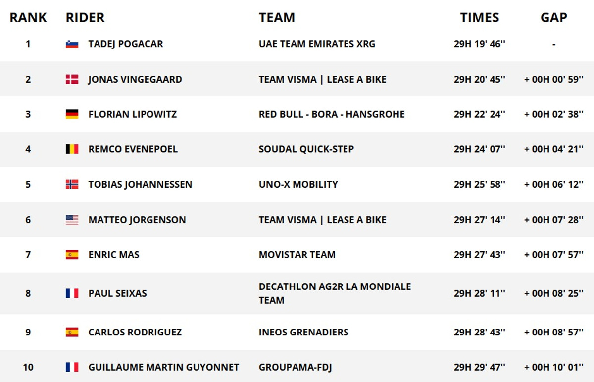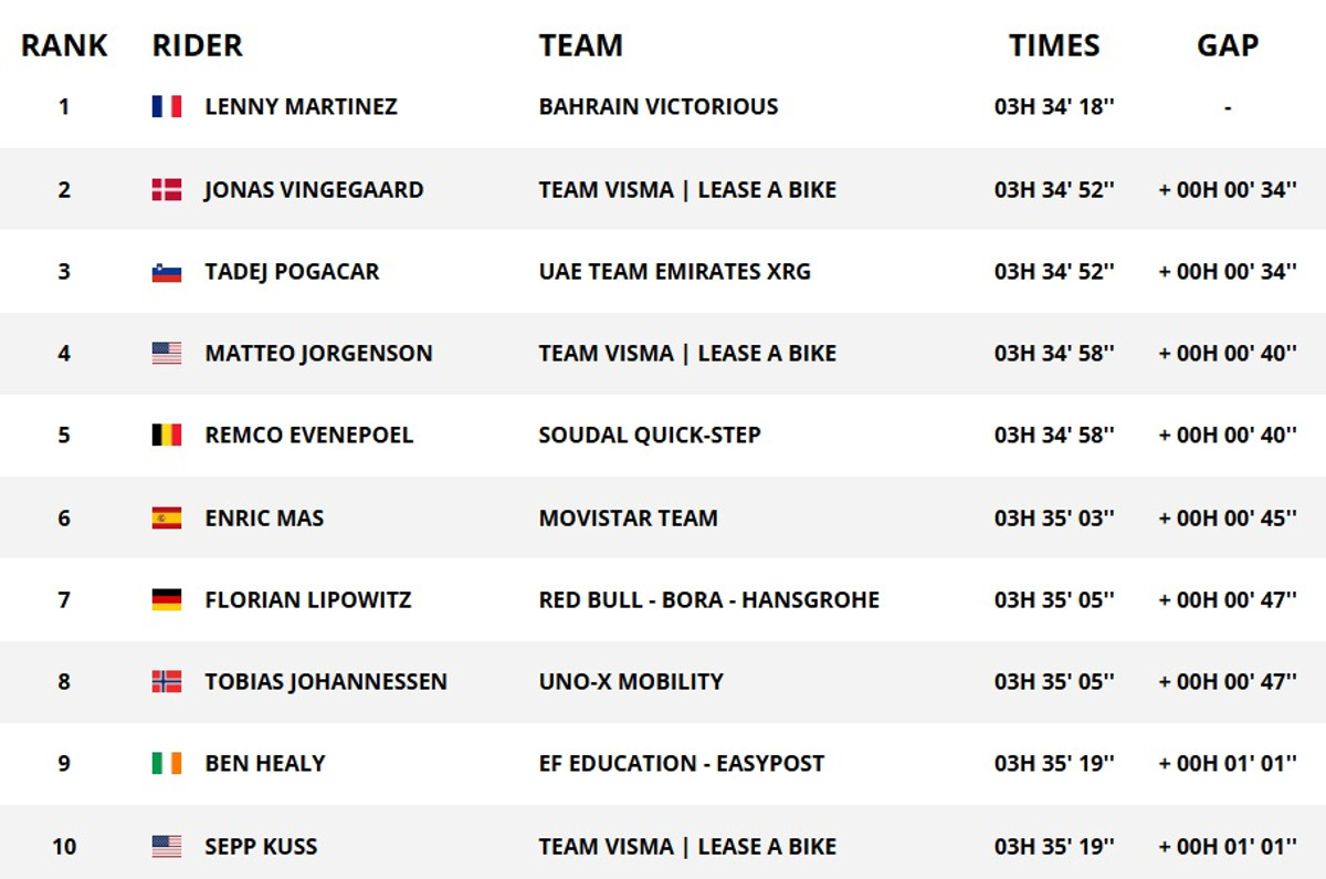 Перемогу на етапі здобув учасник відриву дня, француз Ленні Мартінес із команди Bahrain Victorious. Він на 34 секунди випередив Погачара та данця Йонаса Вінгегора із Visma Lease a Bike, який став другим у загальному заліку. Компанію на подіумі генеральної класифікації їм склав німець Флоріан Ліповітц із Red Bull Bora.