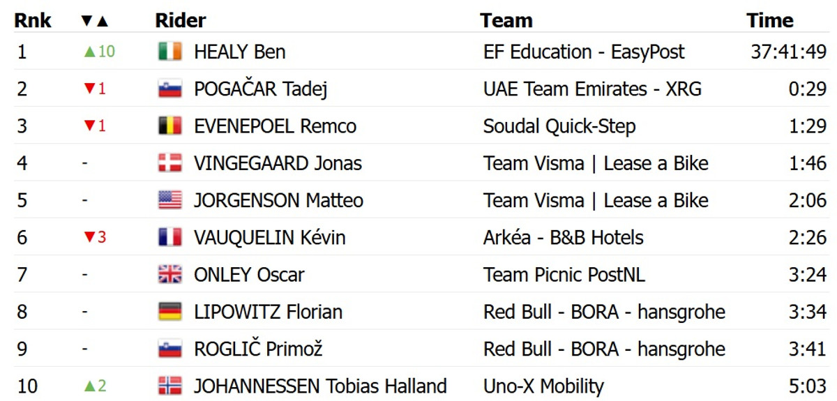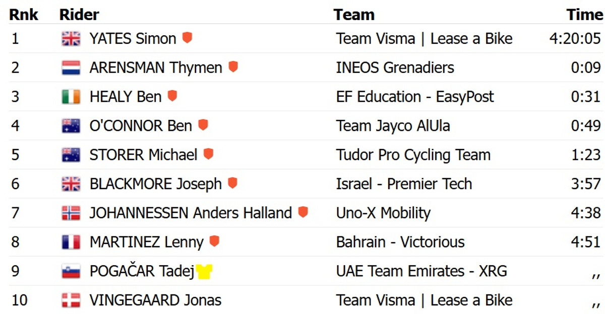 У боротьбі з відриву Єйтс на 9 секунд випередив нідерландця Таймена Аренсмана із команди Ineos Grenadiers. Топ-3 замкнув ірландець Бен Хілі з EF Education EasyPost, який перехопив у Тадея Погачара жовту майку лідера загального заліку.