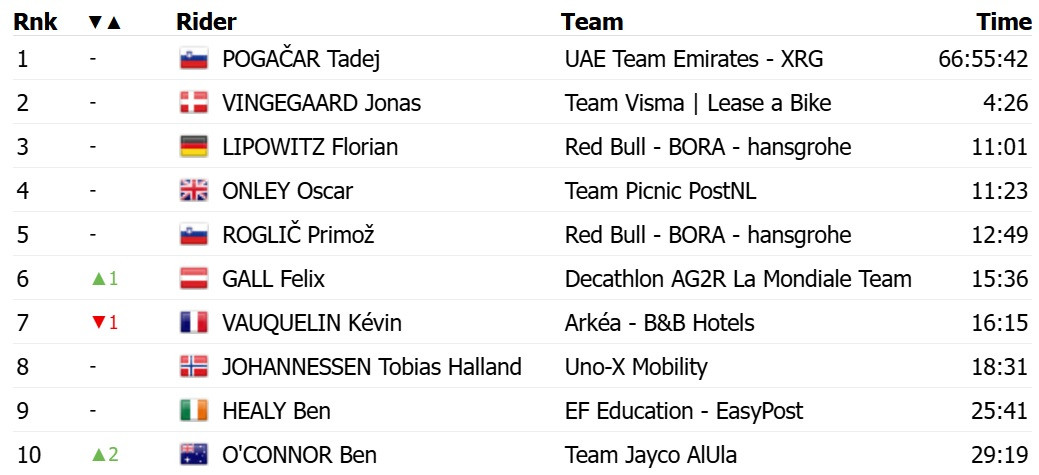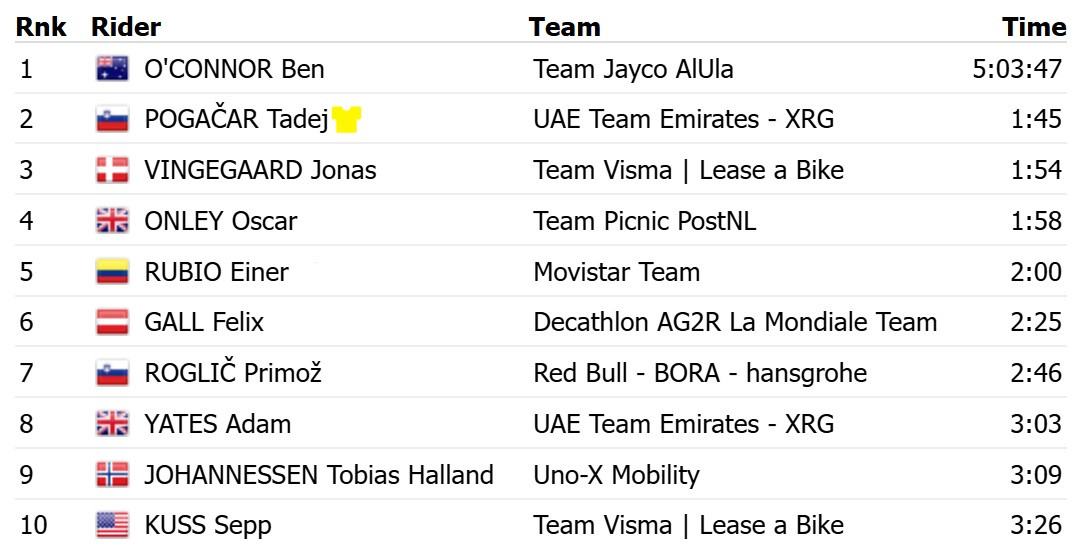 Словенець Тадей Погачар фінішував другим із відставанням у 1 хвилину та 45 секунд, закріпивши своє лідерство в загальному заліку. На 9 секунд відстав від нього його найближчий переслідувач, данець Йонас Вінгегор із Visma Lease a Bike.