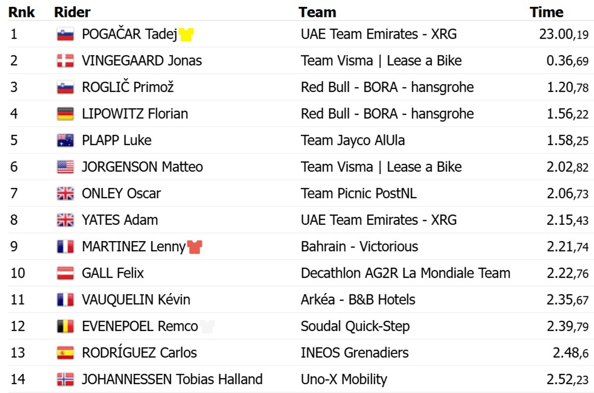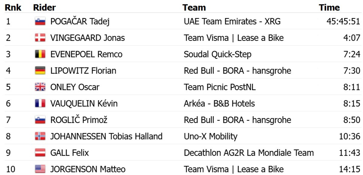 Погачар на 36 секунд випередив данця Йонаса Вінгегора з команди Visma Lease a Bike, закріпивши своє лідерство у загальному заліку. Топ-3 з відставанням у 1 хвилину та 20 секунд замкнув співвітчизник Погачара Прімож Рогліч із Red Bull Bora.