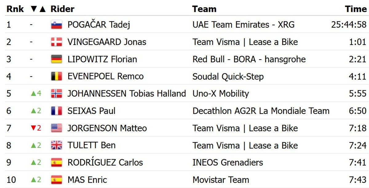 Погачар завдяки атаці за 12 км до фінішу на 14 секунд випередив данця Йонаса Вінгегора із Visma Lease a Bike. Топ-3 замкнув німець Флоріан Ліповіц із Red Bull Bora. Словенець завдяки цій перемозі закріпив своє лідерство у загальному заліку Критеріума Дофіне.