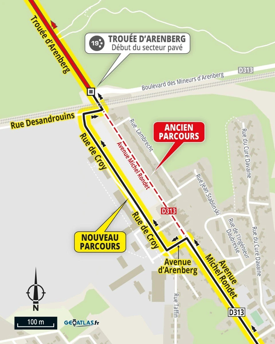 В 2025 році вони знайшли краще рішення для того, щоби погасити швидкість на вході в траншею. За декілька сотень метрів до початку сектору гонщики з'їдуть з центральної вулиці (Авеню Мішеля Ронде) на бічну дорогу Ру де Круа. На центральну дорогу спортсмени повернуться перед пересіканням залізничної колії.