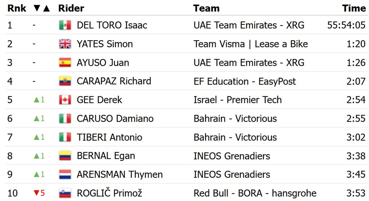 У загальному заліку він відступив з 5 на 10 місце. Рожеву майку лідера зберіг мексиканець Ісаак Дель Торо з UAE Emirates.