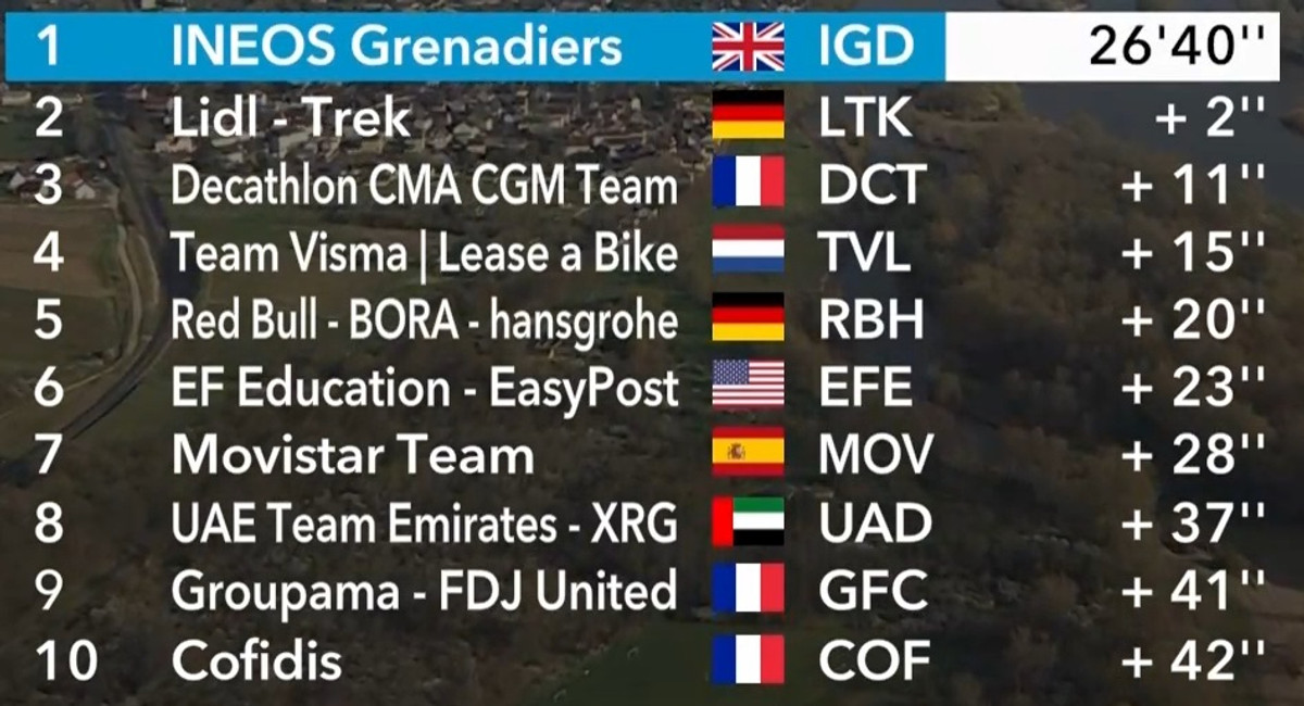 Вони на 2 секунди випередили німецько-американську Lidl Trek. Топ-3 замкнула французька Decathlon CMA CGM. Жовту майку лідера загального заліку перехопив іспанський велогонщик Хуан Аюсо із команди Lidl Trek.