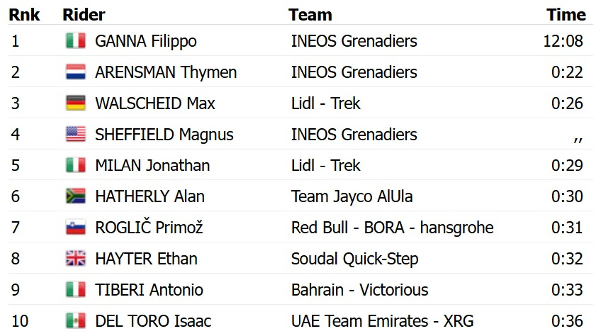 Ганна на 22 секунди випередив партнера по команді, нідерландця Таймена Аренсмана. Топ-3 з відставанням у 26 секунд замкнув німець Макс Вальшайд із Lidl Trek.