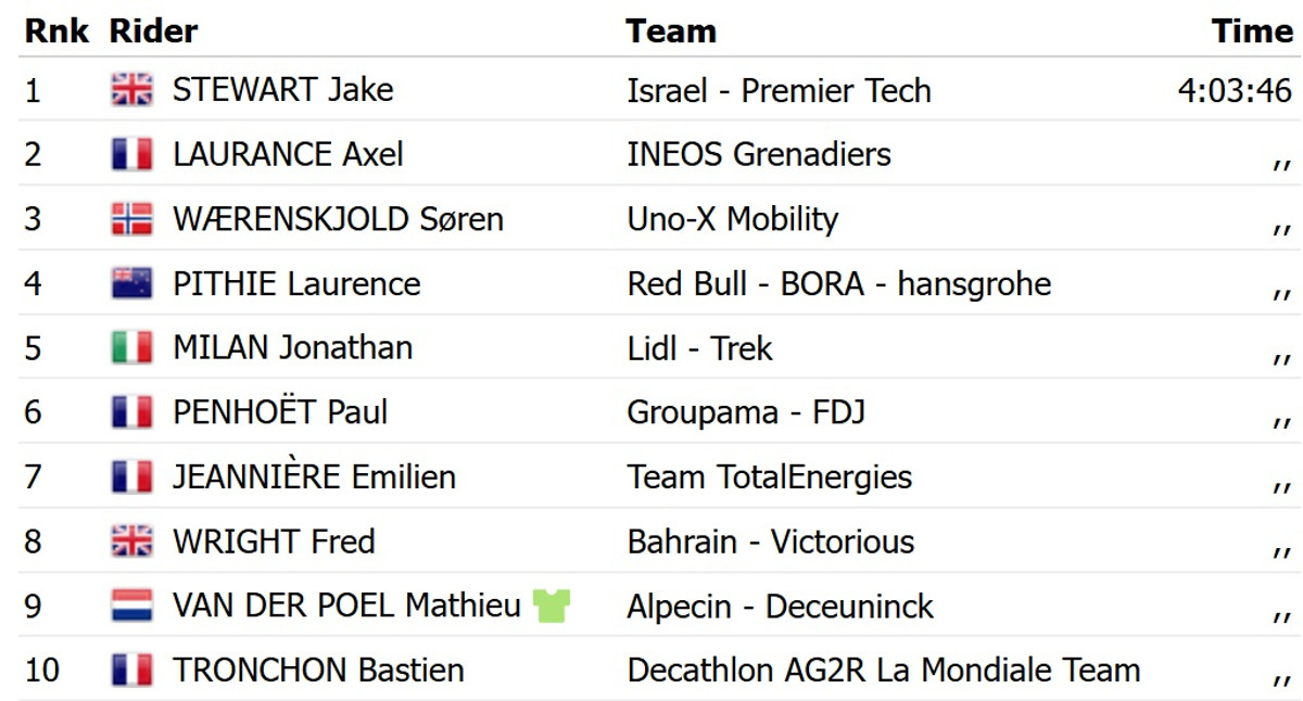 У фінішному спринті з пелотону Стюарт випередив француза Акселя Лоранса з Ineos Grenadiers і норвежця Сорена Верешольда із UnoX. Головний фаворит, італієць Джонатан Мілан із Lidl Trek, фінішував лише п’ятим.