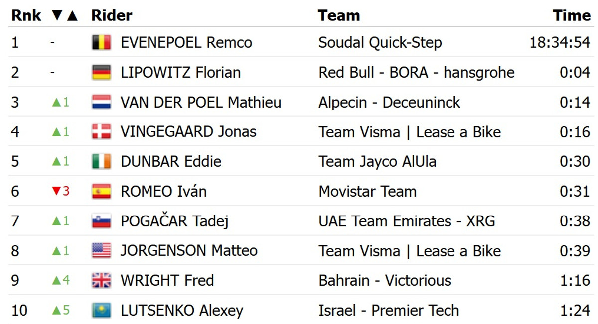 Жовту майку лідера загального заліку зберіг переможець четвертого етапу, бельгієць Ремко Евенепул із Soudal Quick Step.