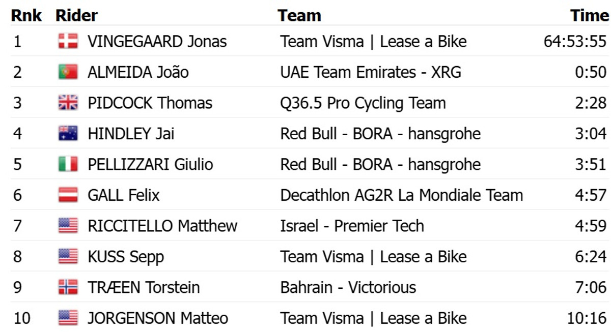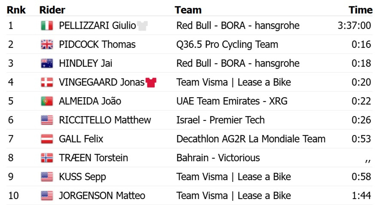Пелліццарі завдяки атаці за 3,5 км до фінішу на 16 секунд випередив британця Тома Підкока з команди Q36.5. Топ-3 з відставанням у 18 секунд замкнув партнер Пелліццарі по Red Bull Bora, австралієць Джей Хіндлі. Для 21-річного італійського таланта це перша в кар’єрі перемога на етапах Гран турів.