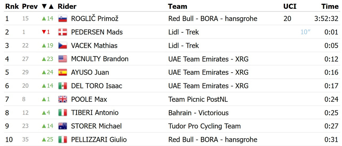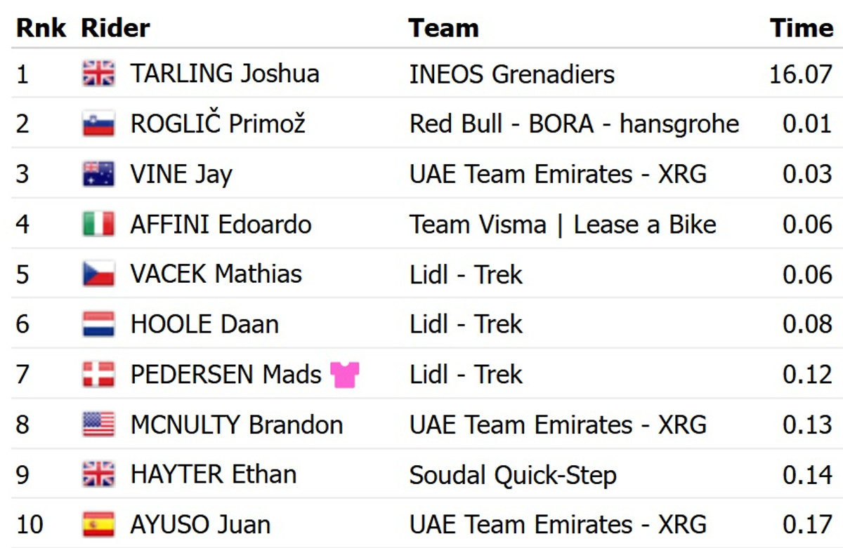 Тарлінг усього на 1 секунду випередив словенця Пріможа Рогліча із команди Red Bull Bora. Третій час показав австралієць Джей Вайн із UAE Emirates, який програв три секунди. Рогліч завдяки цьому результату перехопив рожеву майку лідера загального заліку.