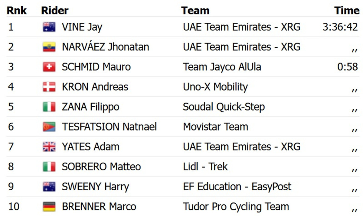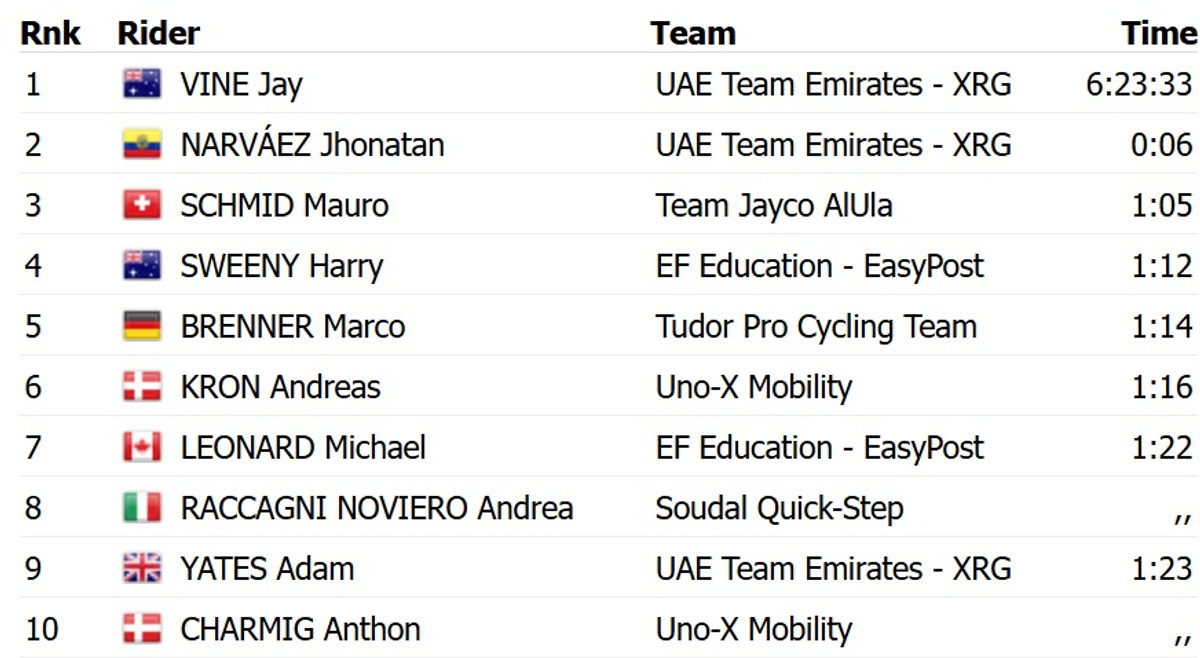 Вайн атакував на останньому підйомі за 14 км до фінішу разом зі своїм партнером по команді Джонатаном Нарваесом. У підсумку вони випередили переслідувачів на 58 секунд. Топ-3 із групи переслідувачів замкнув швейцарець Мауро Шмід із Jayco AlUla.