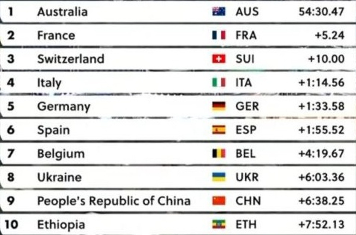 Перемогу здобула збірна Австралїі в складі Броді Чепмен, Аманди Спретт, Фелісіті Вілсон-Хаффенден, Джея Вайна, Люка Плаппа та Майкла Меттьюза. Вони на 5 секунди випередили команду Франції, бронзовими призерами стали швейцарці, які програли чемпіонам 10 секунд. Результат української команди виявився на 6 хвилин і 3 секунди гіршим за час переможців.