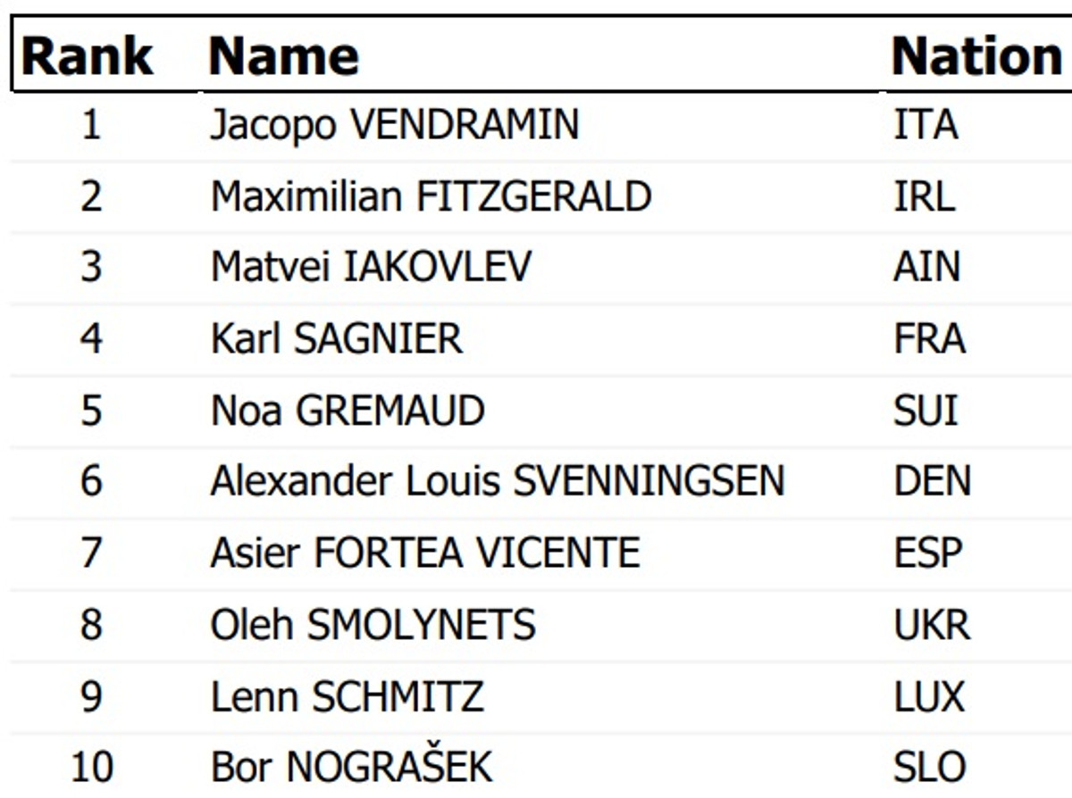 Золото завоював італієць Якопо Вендрамін, який випередив ірландця Максімільяна Фітцджеральда та "нейтрального" Матвєя Якослєва. Львів’янин Смолинець був єдиним представником України в цій гонці, сумарно на старт вийшли 23 спортсмени.