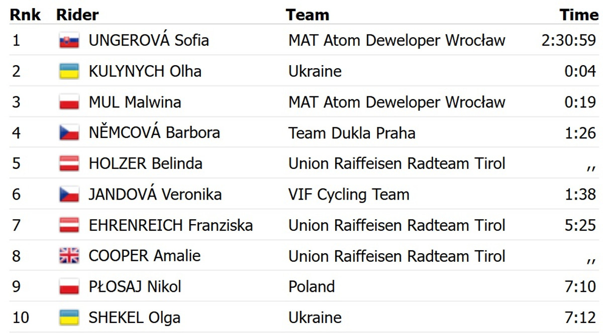 25-річна спортсменка, яка представляла на гонці збірну України, програла 4 секунди переможцеві, господарці змагань Софії Унгеровій з команди MAT Atom Deweloper. Топ-3 замкнула ще одна представниця цієї команди, полячка Мальвіна Муль.