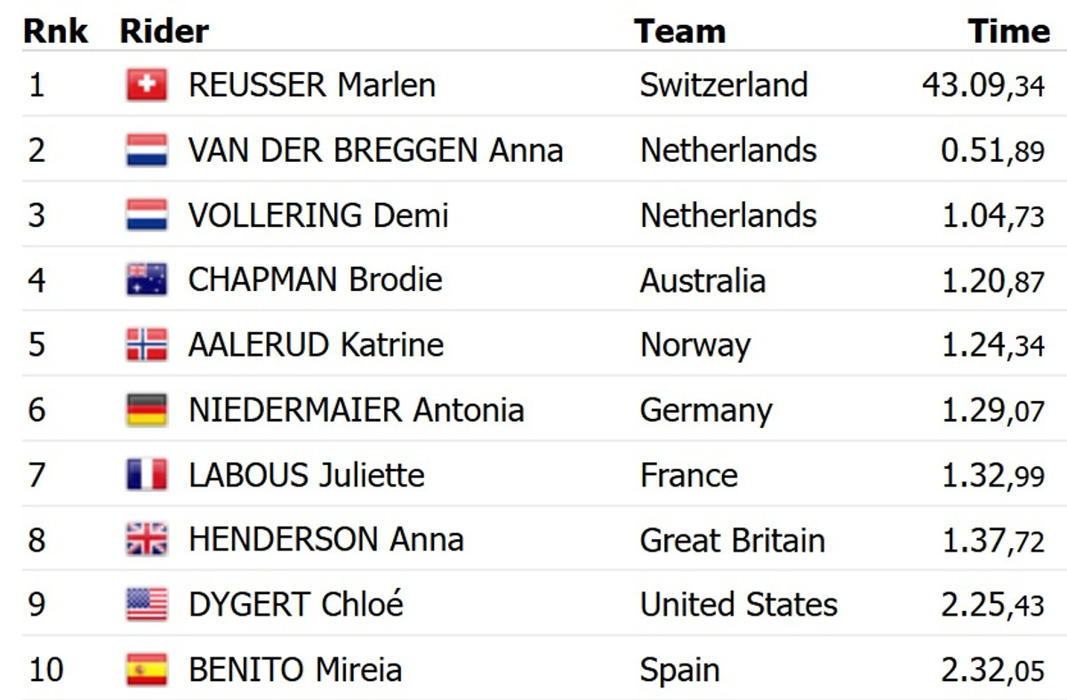 Переконливу перемогу здобула швейцарка Марлен Ройссер. Вона на 51 секунду випередила нідерландку Анну Ван дер Брегген. Топ-3 замкнула ще одна представниця Нідерландів, Демі Воллерінг.