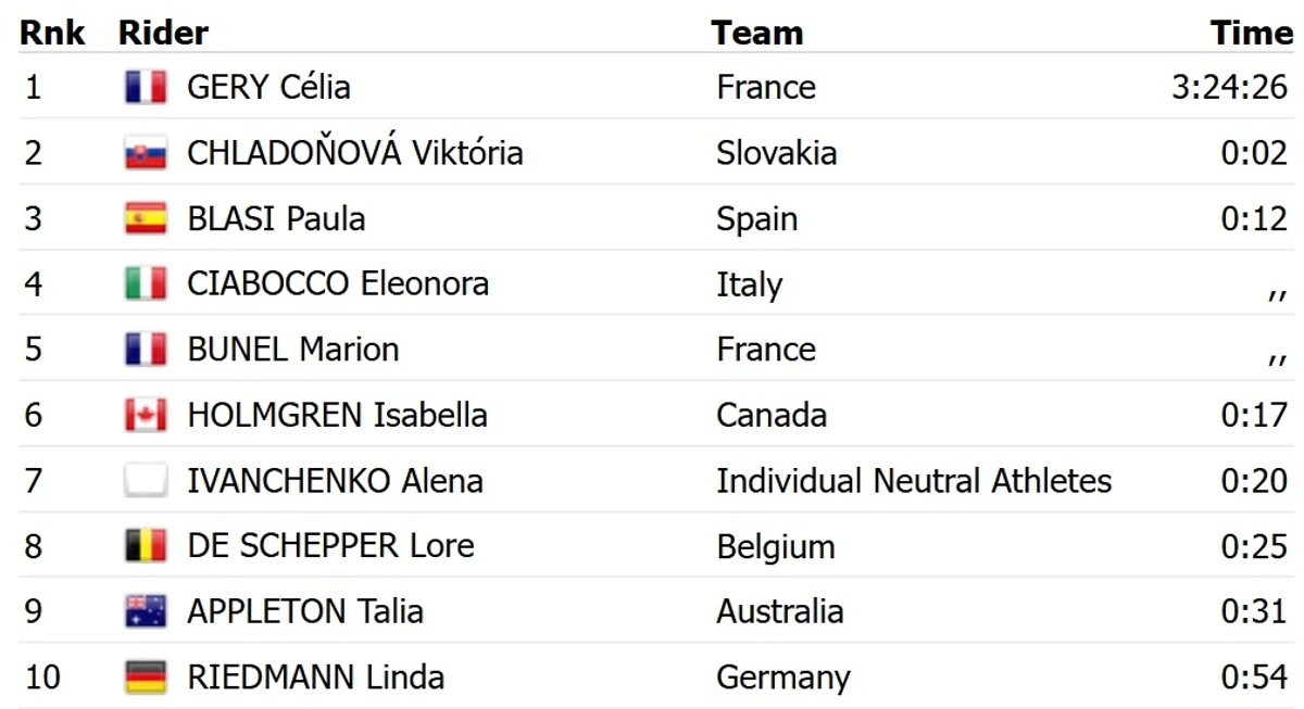 Перемогу здобула француженка Селія Жері. На фініші вона на 2 секунди випередила словачку Вікторію Хладонову. Бронзу завоювала іспанка Паула Бласі, яка виграла спринт із групи переслідувачів, що програла 12 секунд.