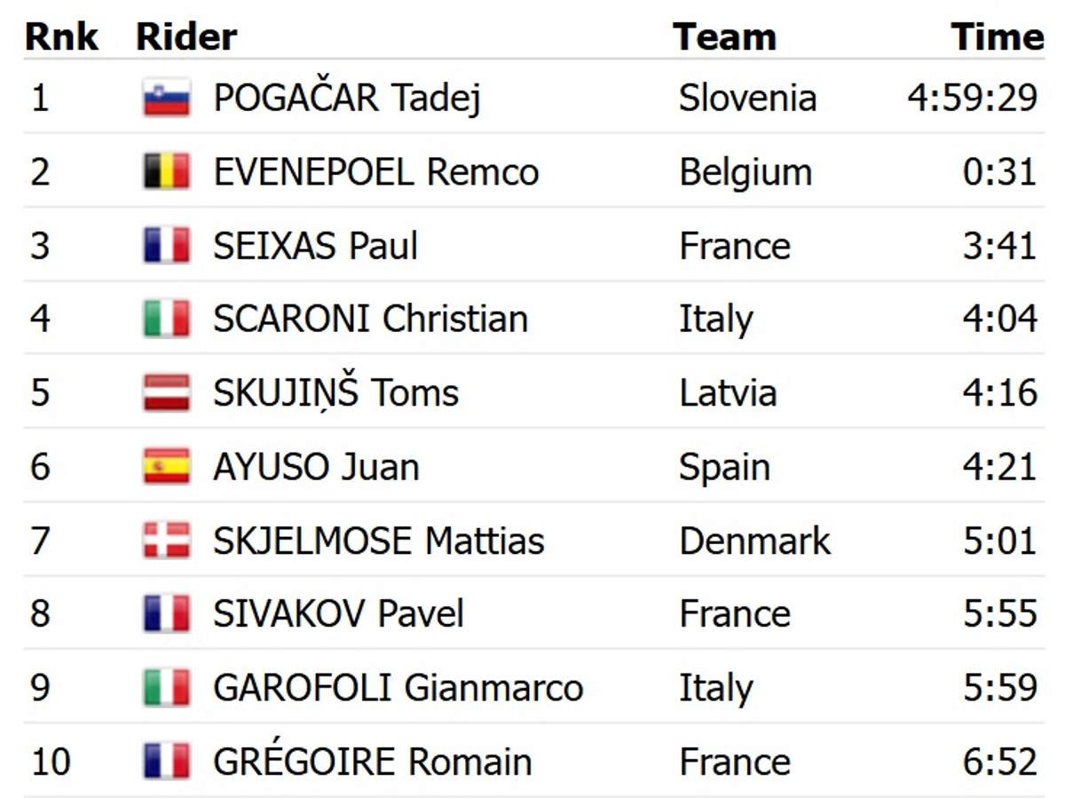 Вирішальною виявилася сольна атака Погачара за 75 км до фінішу. В підсумку словенець на 31 секунду випередив бельгійця Ремко Евенепула. Бронзу завоював наймолодший учасник гонки – 19-річний господар змагань Поль Сейксас, який у боротьбі за третє місце здолав італійця Крістіана Скароні.