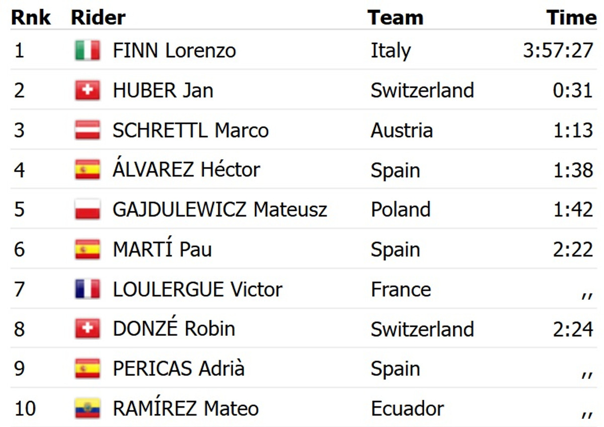 Перемогу здобув італієць Лоренцо Фінн, який на 31 секунду випередив швейцарця Яна Хубера. Бронзу з відставанням у 1 хвилину та 13 секунд завоював австрієць Марко Шреттль.