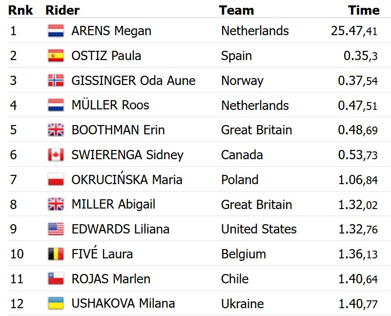 Перемогу здобула нідерландка Меган Аренс, яка на дистанції в 18,3 км на 35 секунд випередила іспанку Паулу Остіс. Бронзу завоювала представниця Норвегії Ода Ауне Гіссінгер. Ушакова програла результату Аренс 1 хвилину та 40 секунд.