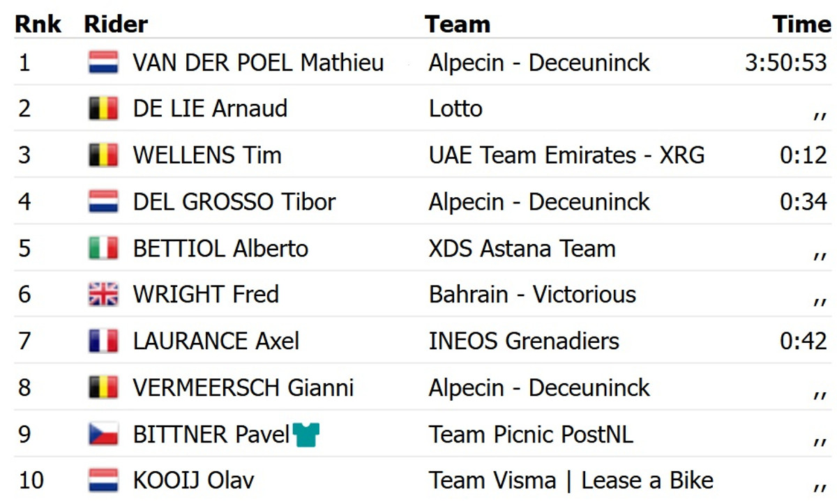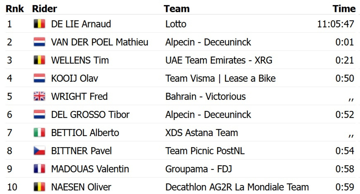 Ван дер Пул у фінішному спринті випередив бельгійця Арно Де Лі з команди Lotto. Топ-3 замкнув ще один бельгієць, Тім Велленс із UAE Emirates, який програв 12 секунд. Ван дер Пулу ця перемога дозволила піднятися на друге місце у загальному заліку багатоденки, лідерство перехопив Де Лі.