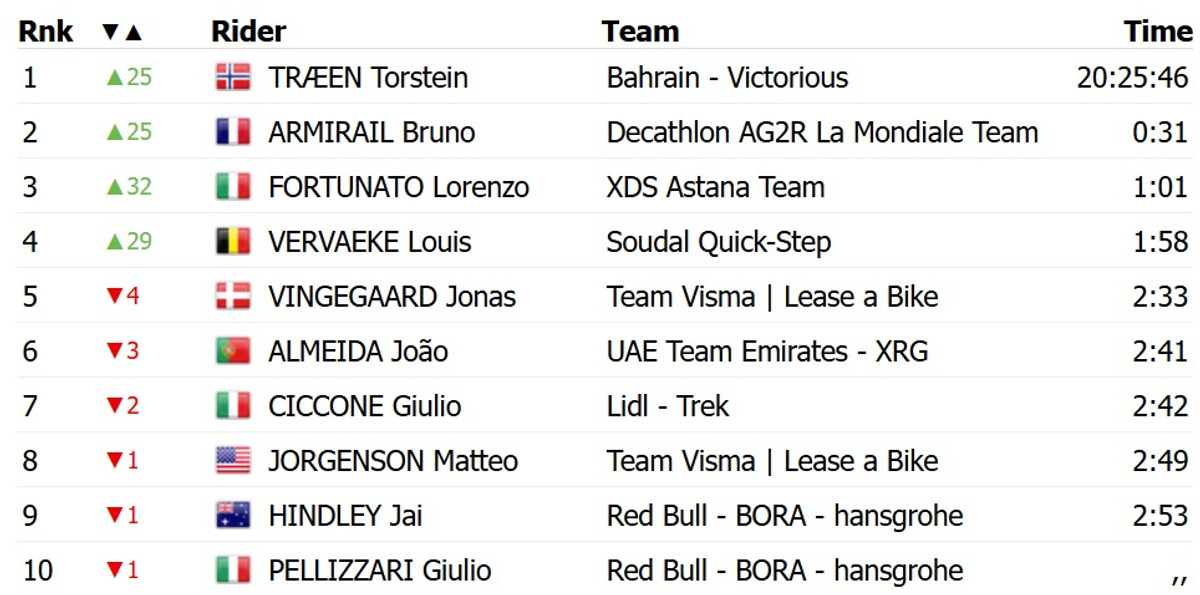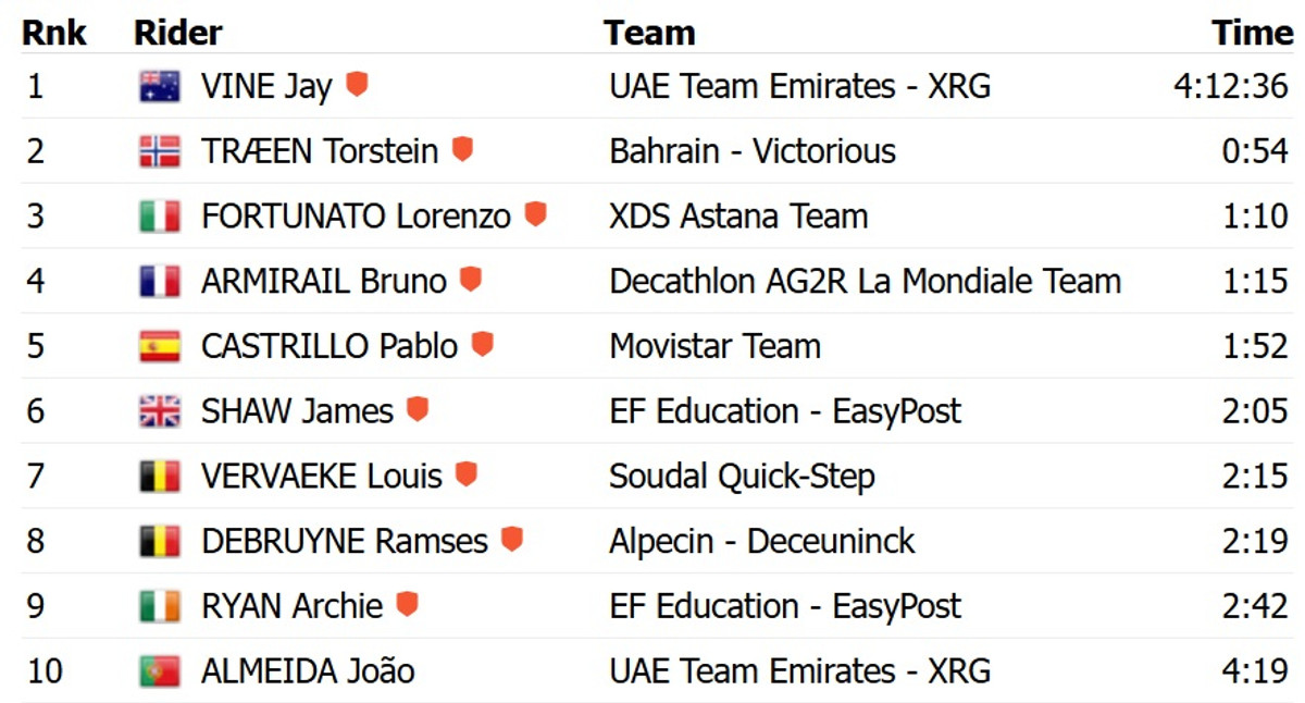 У боротьбі з відриву Вайн на 54 секунди випередив норвежця Торстена Трена із Bahrain Victorious, топ-3 із відставанням у 1 хвилину та 10 секунд замкнув італієць Лоренцо Фортунато із XDS Astana. Трен завдяки сьогоднішньому успіху перехопив червону майку лідера загального заліку.