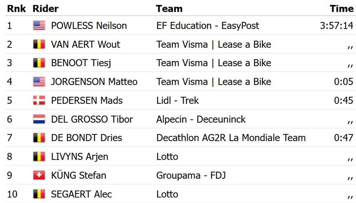 На фініші американець несподівано випередив одразу трьох гонщиків нідерландської команди Visma Lease a Bike – бельгійців Воута Ван Арта та Тіша Беннота, а також минулорічного переможця цієї гонки, американця Маттео Йоргенсона.