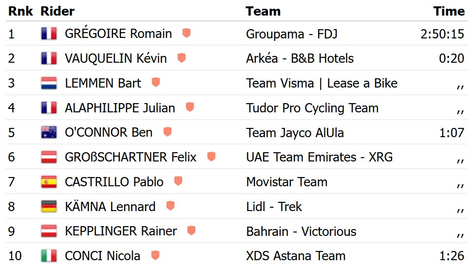 У боротьбі з відриву Грегуар на 20 секунд випередив співвітчизника Кевіна Воклена із Arkea B&B Hotels і нідерландця Барта Леммена із Visma Lease a Bike. Пелотон програв Грегуару 3 хвилини та 12 секунд.