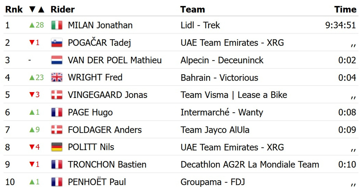 Цей успіх дозволив Мілану перехопити жовту майку лідера загального заліку. З одинаком часом із італійцем іде переможець першого етапу Тадей Погачар, проте словенець поступається гонщику Lidl Trek за сумою місць на етапах.
